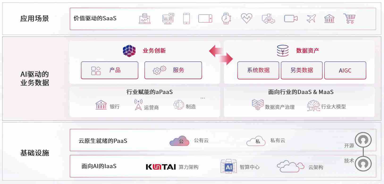 数字时代,,,,围绕企业数字化转型的关键要素,,,,尊龙旗舰厅数码开创性的提出数云融合战略和技术体系框架,,,着力在云原生、、、、数字原生、、、AI原生和信创产业上架构产品和服务能力,,,为处在不同数字化转型阶段的快消零售、、、、汽车、、、、金融、、医疗、、、政企、、教育、、、、运营商等行业客户提供泛在的敏捷IT能力和融合的数据驱动能力,,构建跨界融合创新的数字业务场景和新业务模式,,,助力企业级客户建立面向未来的核心能力和竞争优势,,,全面推动社会的数字化、、智能化转型升级。。